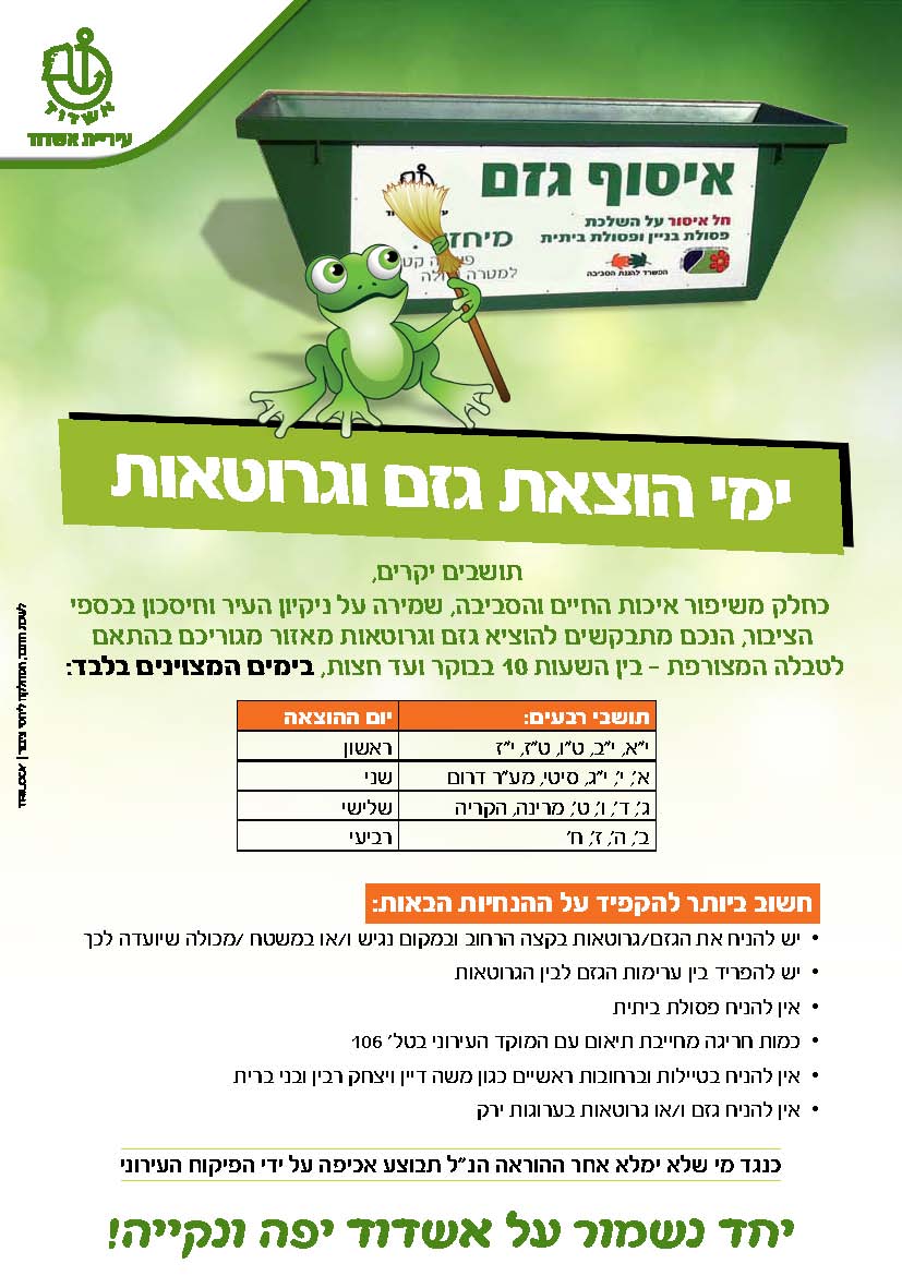 כחלק משיפור איכות החיים והסביבה, שמירה על ניקיון העיר וחיסכון בכספי הציבור, עיריית אשדוד מפנה את הגזם והגרוטאות בימים קבועים ברבעים השונים.